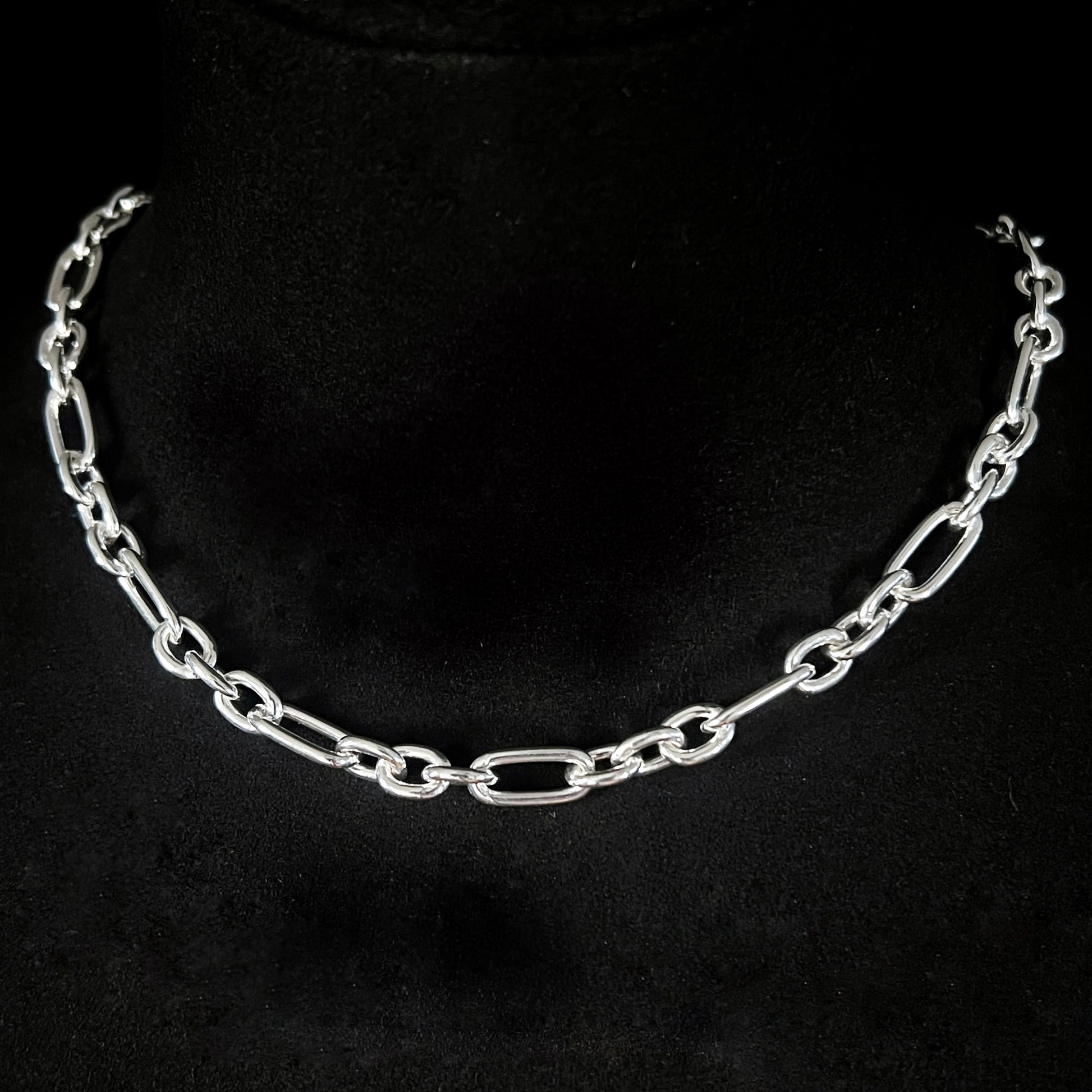 With its darkened finish and thick-cut links, this 16-inch oxidised fetter chain carries heavyweight edge and sits high on the collarbone with intent — never left to chance.